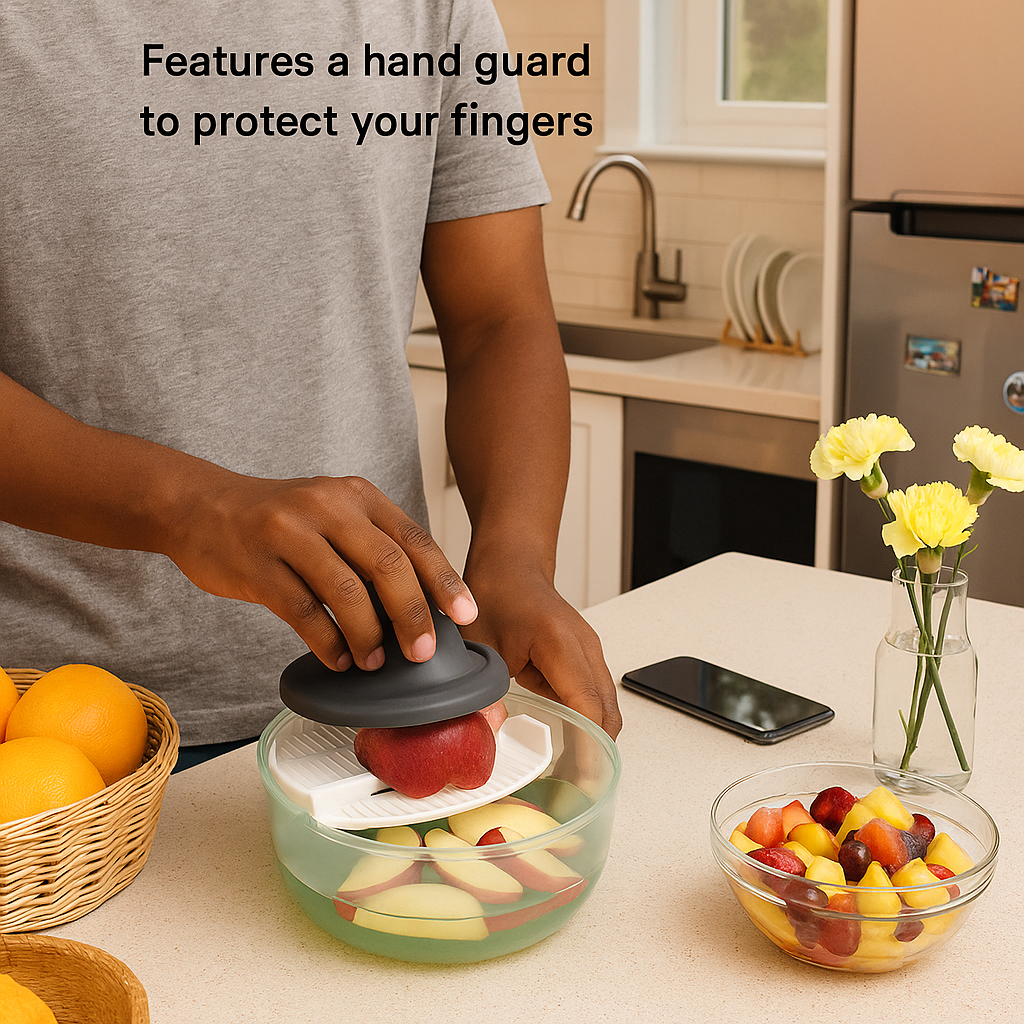 Effortlessly slice apples with built-in hand protection. Surrounded by fresh fruit, a sunny kitchen, and modern appliances, this tool blends safety, style, and convenience for everyday meal prep.