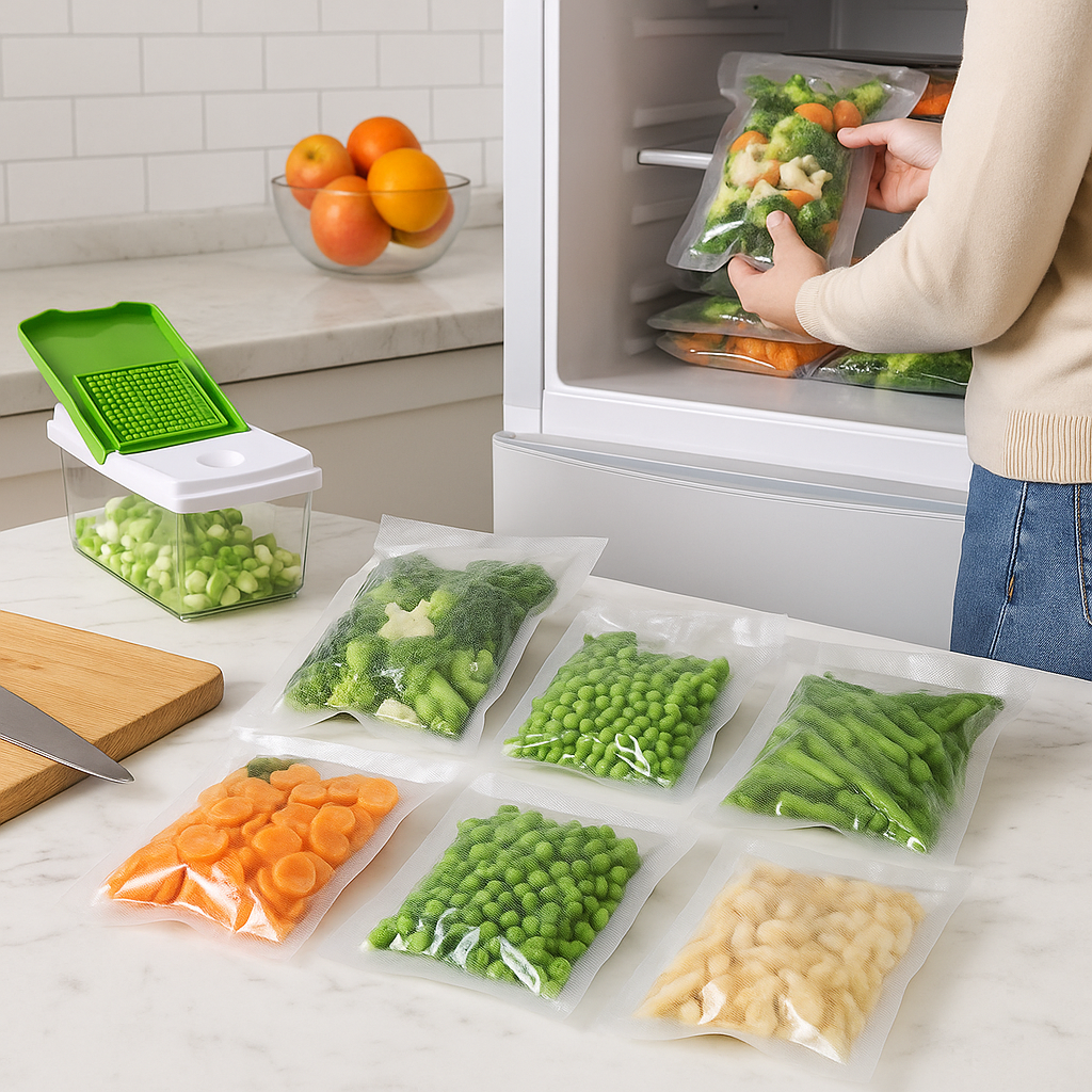 Keep your vegetables crisp and colorful with vacuum sealing. Easily prep, pack, and store produce in freezer-safe bags. Perfect for healthy meals, less waste, and a tidy kitchen.