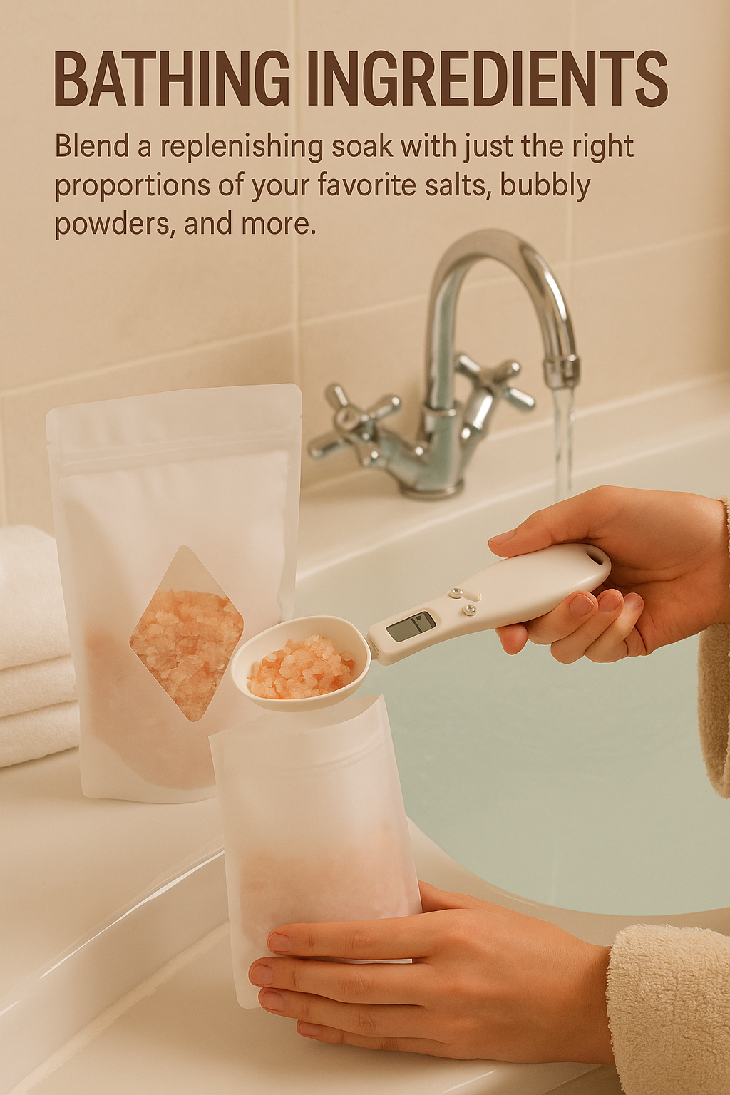 Scoop the perfect amount of bath salts every time. This smart spoon makes self-care effortless—calm your senses and save your ingredients with pinpoint accuracy and spa-worthy ease.