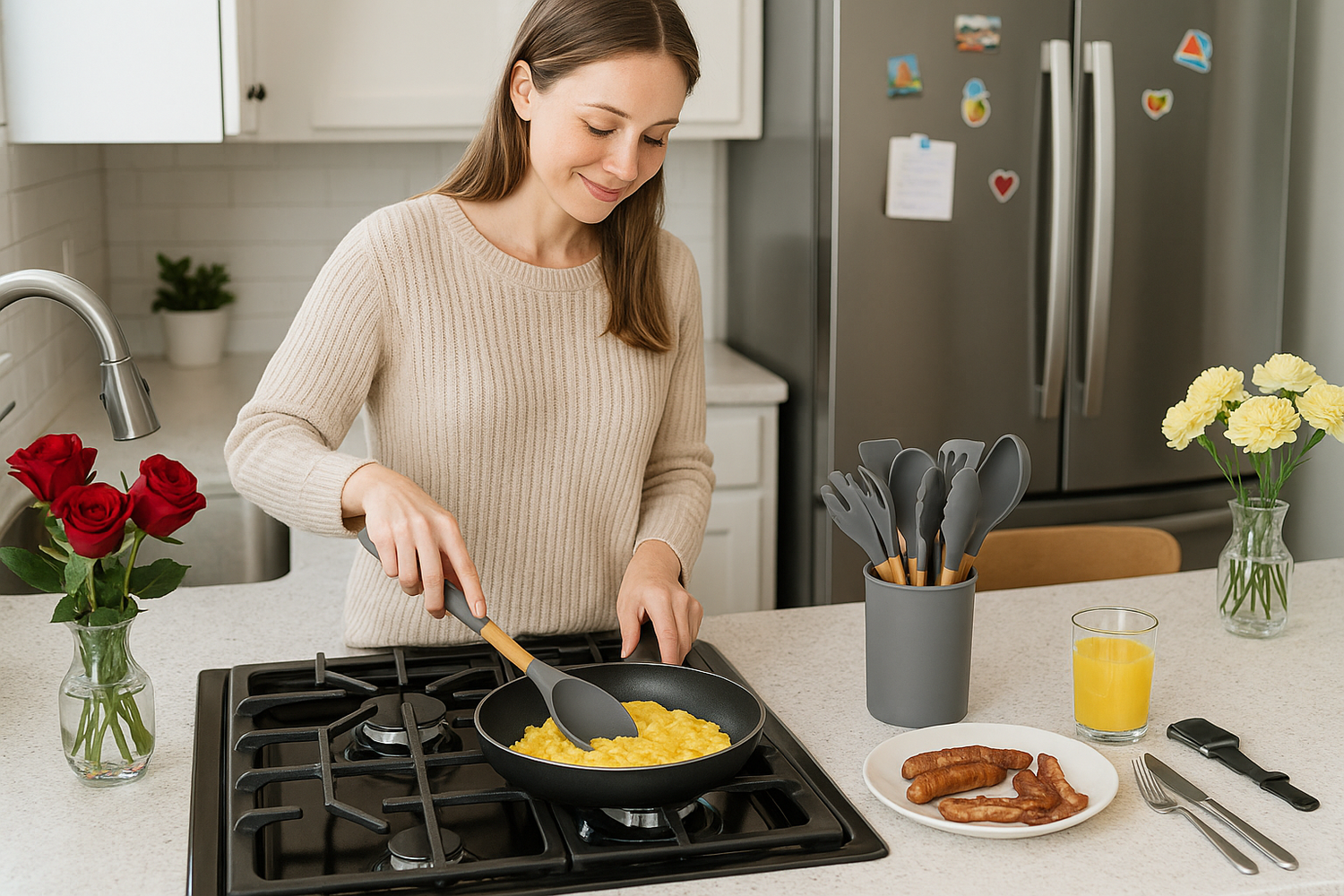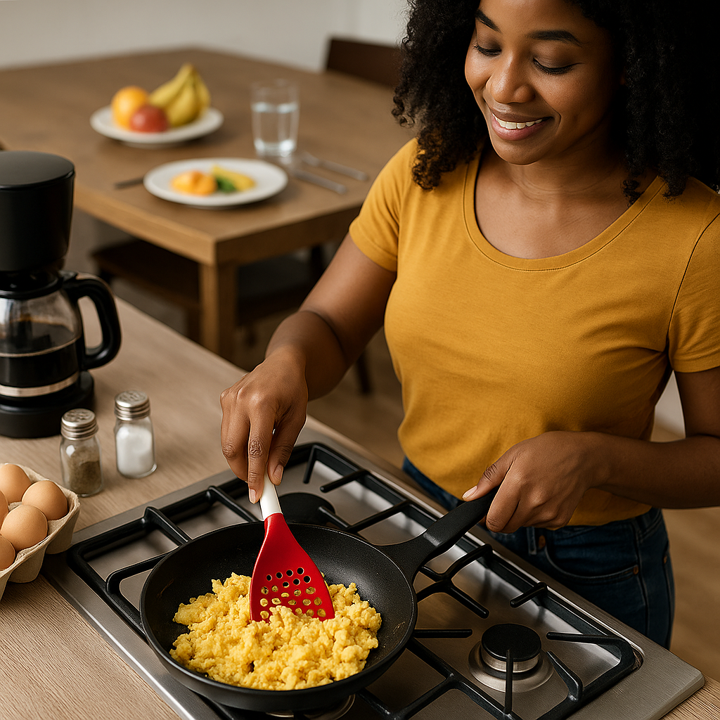 Start your day with protein breakfast prepared with our silicone utensils. Perfect for making breakfast—heat-resistant, non-stick safe, and stylishly organized. Includes holder, ideal for modern kitchen routines.