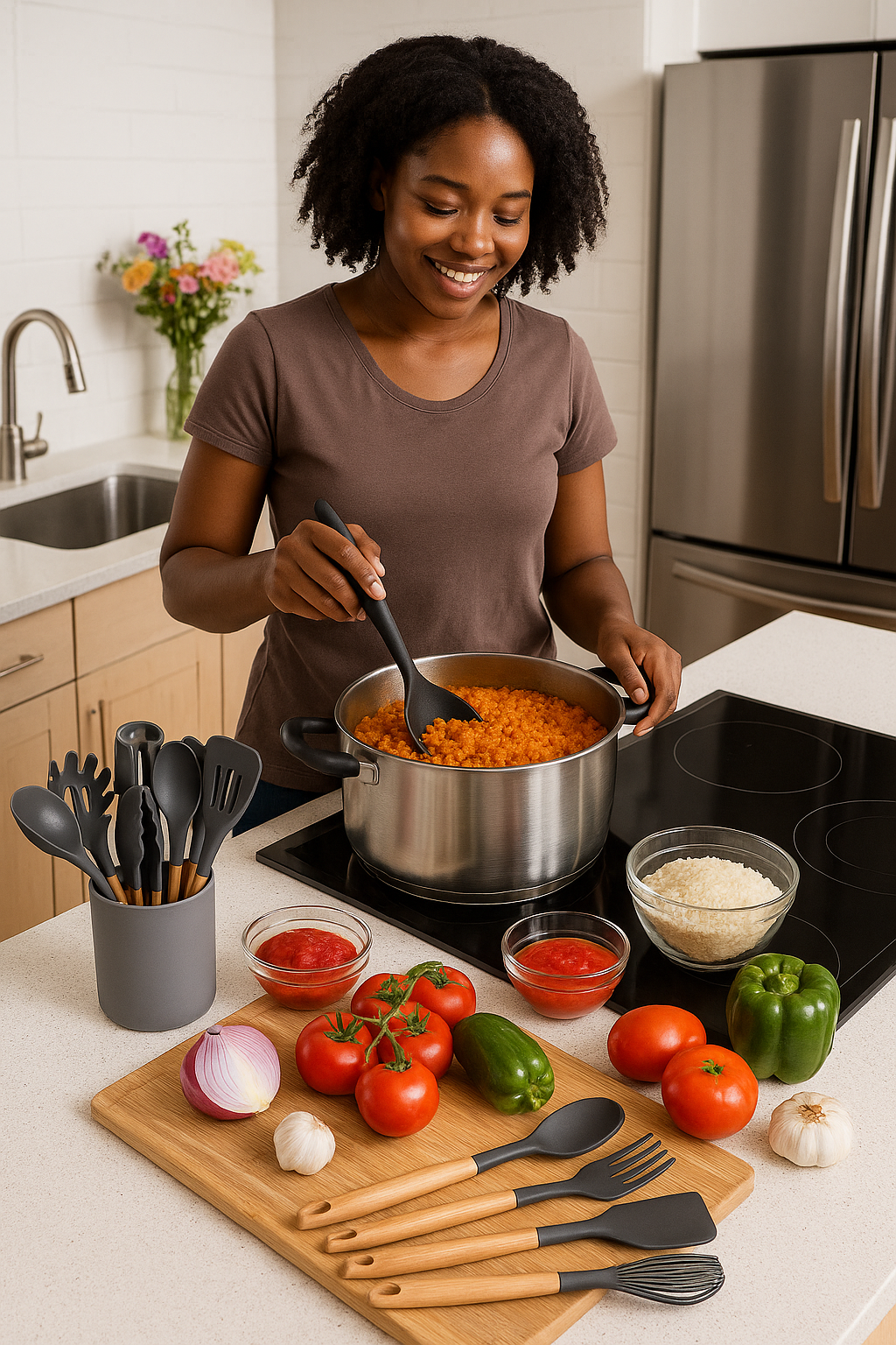 A complete, heat-resistant silicone utensil set with eco-friendly wooden handles—safe for non-stick cookware, easy to clean, and beautifully organized for every kitchen.