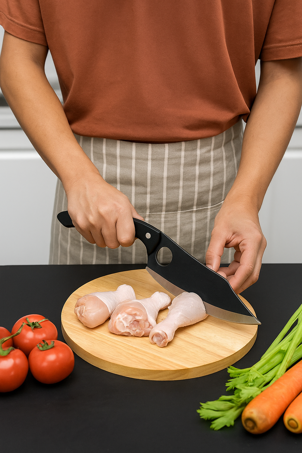 Effortlessly chop meats and vegetables with this precision chef cleaver. Designed for balance and power, it slices through chicken, carrots, and celery with ease—perfect for everyday kitchen prep.
