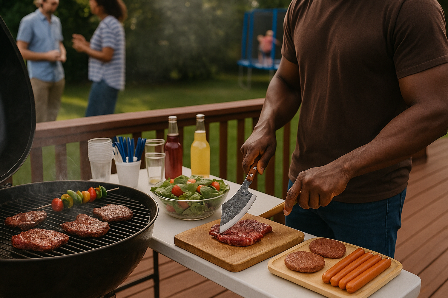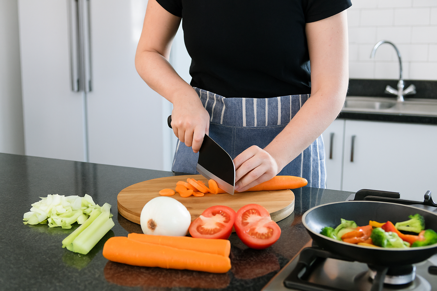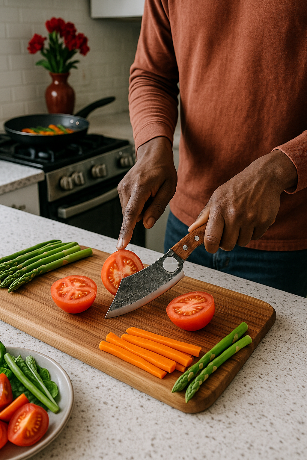This forged cleaver knife ensures clean, effortless cuts through vegetables like tomatoes, carrots, and asparagus. Its ergonomic grip and sharp edge make kitchen prep faster, safer, and more precise.